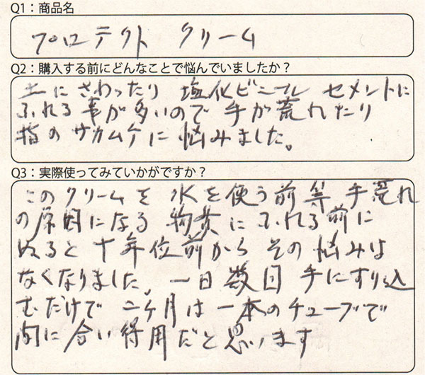 このクリームを水を使う前など手荒れの原因になる物質にふれる前に塗ると十年位前からその悩みはなくなりました。一日数回手にすり込むだけで二ヶ月は一本のチューブで間に合い得用だと思います。